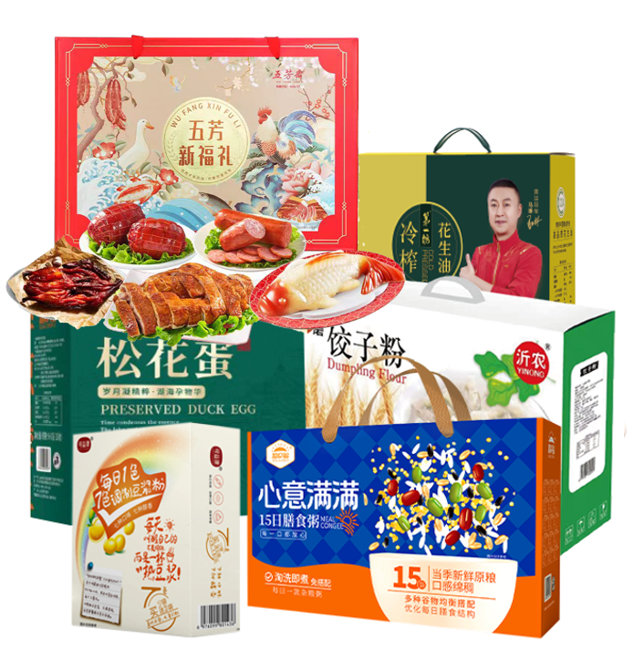 家宴自选册898型悦尚B------- 套餐更新为:五芳斋五芳新福礼1.83kg+ 粮口福松花蛋960g礼盒+第一坊冷榨花生油1L×2礼盒+粮口福每日膳食粥(心意满满)礼盒+沂农石磨饺子粉礼盒4kg+可益康七色调制豆浆粉300g礼盒
