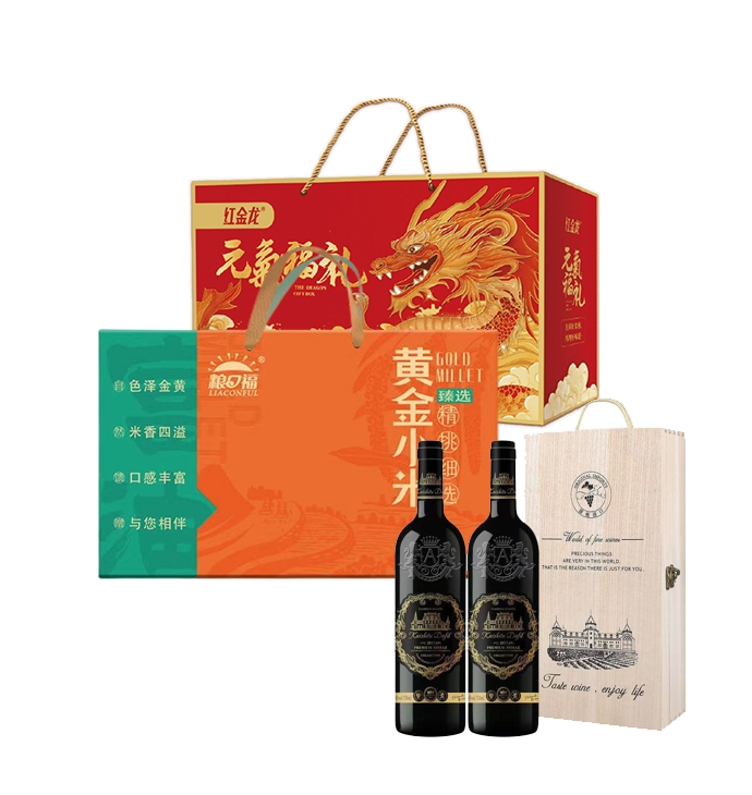 家宴食品卡悦润698型套餐G-----26年红金龙生鲜大礼包3650g礼盒+戴菲勒双支原色木盒装礼盒+粮口福黄金小米2.3kg礼盒