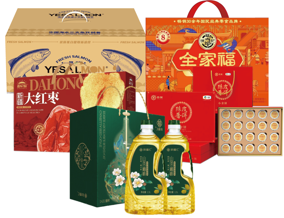 合家1698型套餐C---------天山跃出新疆三文鱼1520g礼盒 +中茶-陈皮普洱小金饼200g礼盒+ 纳福汇山茶橄榄油礼盒1500ml*2 +粮口福新疆大红枣1000g礼盒 +徐福记全家福922g礼盒