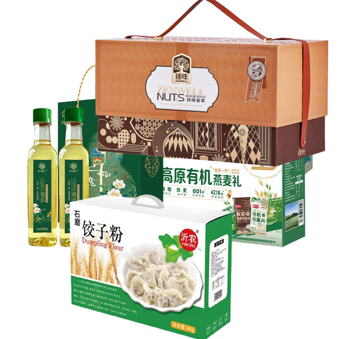 家宴食品卡悦润698型套餐I-------好麦多高原有机燕麦礼1200g礼盒+沂农石磨饺子粉礼盒4kg礼盒+纳福汇山茶橄榄油礼盒500ml*2 +臻味-2300g环球荟萃礼盒