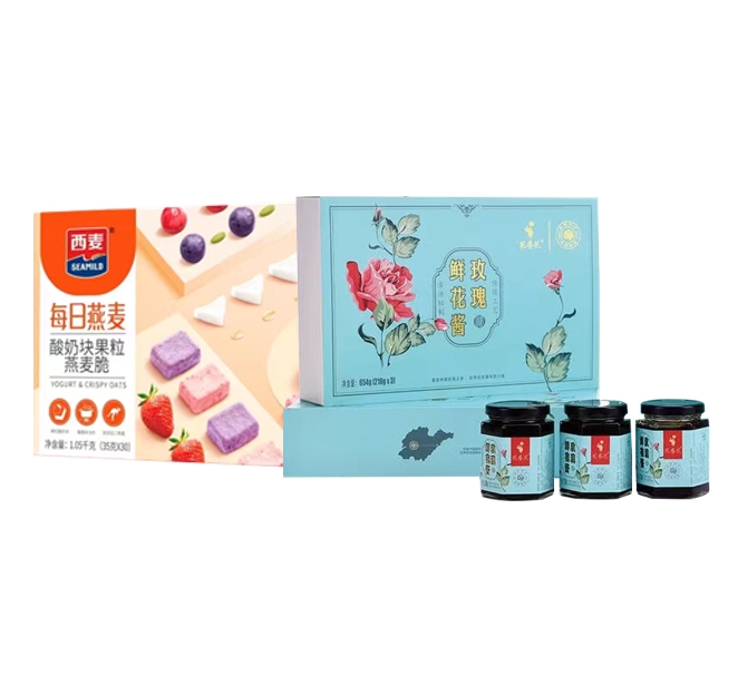 老套餐三只松鼠已下架,更换为:麦每日燕麦-酸奶块果粒燕麦脆礼盒+ 聚瑞德鸭蛋礼盒60g*30枚+沃隆每日坚果500g礼盒+好想你枣每日红枣900g