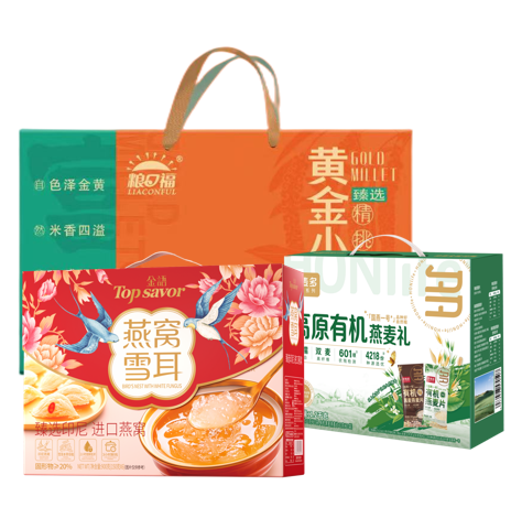 家宴食品卡悦翔518套餐F--------金语燕窝雪耳900g礼盒+ 好麦多高原有机燕麦礼1200g礼盒+粮口福黄金小米2.3kg礼盒