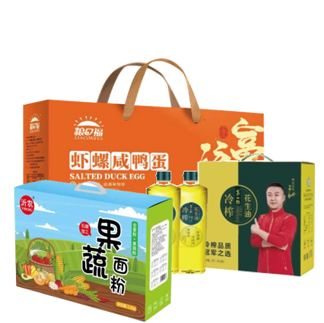 家宴食品卡悦翔518套餐G------粮口福虾螺咸鸭蛋1.2kg礼盒+第一坊冷榨花生油1L×2礼盒+ 沂农果蔬杂粮饺子粉2.5kg礼盒