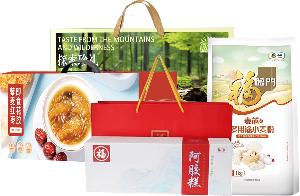 中粮二十一选一898型定制款-套餐C----------藜麦即食花胶礼盒A款 藜麦红枣花胶200g*6碗 + 福牌阿胶糕礼盒 规格:240g+ 粮口福探索珍礼山珍礼盒1050g + 中粮福临门麦芯多用途小麦粉 规格:1000g