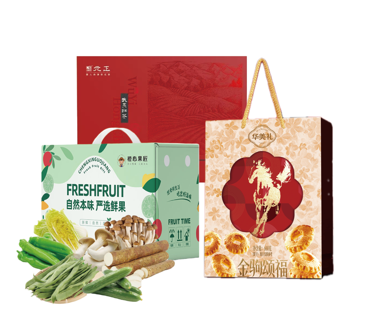 悦活898型套餐J------端阳鲜蔬蔬菜礼盒 + 元正武夷红茶210g礼盒 + 华美600G 金驹颂福礼盒