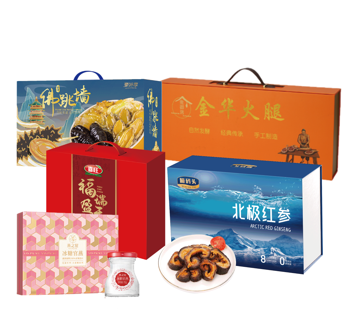 乐享2198型套餐E-----燕之屋即食瓶装燕窝70g*5礼盒+金御蒋金华火腿3斤切片礼盒(纸盒)+ 喜旺福瑞盈香2010g肉食礼盒+ 豪味享金汤家宴1000g礼盒 +喵码头北极红参500g礼盒