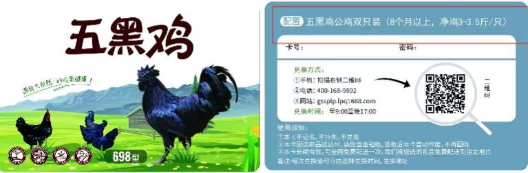 美味鲜生鲜卡1698型——D.五黑鸡公鸡双只装(8个月以上, 净鸡3-3.5斤/只)+绿壳蛋礼盒+莱芜公鸡一只3.5-4斤(12个月以上)+ 芦花母鸡一只3-3.5斤(10个月以上)+一颗红心鸡蛋20枚