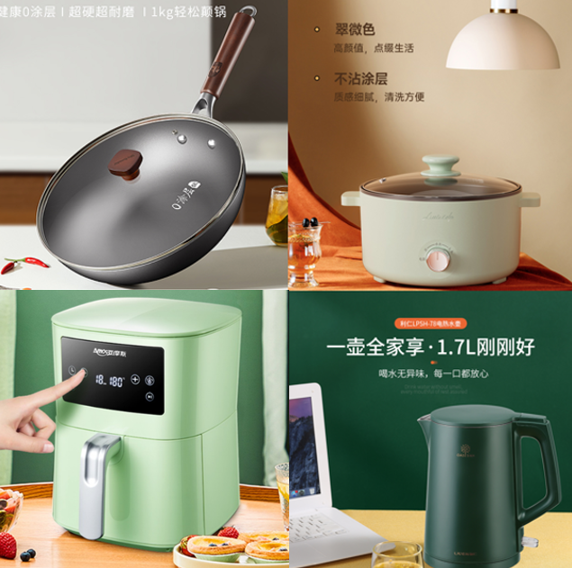 合家1698型套餐U------九阳有钛0涂层铁锅+小画仙多功能电火锅5L翠微色LDZG-5066+利仁LPSH-78电热水壶+亚摩斯空气炸锅电脑版AS-AF360