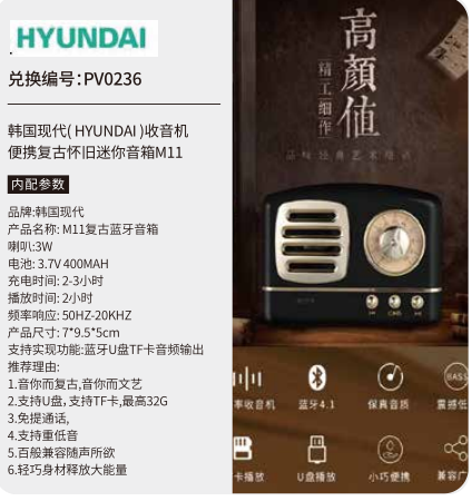 中粮五十选一礼品册200型--韩国现代( HYUNDAI )收音机 便携复古怀旧迷你音箱M11