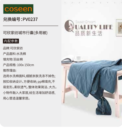 中粮五十选一礼品册200型--可欣家纺城市行囊(多用被)