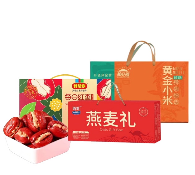 沃隆尊典礼坚果礼盒328型-------套餐升级为:粮口福黄金小米2300g+好想你红枣夹核桃礼盒900g+西麦燕麦礼礼盒1020g